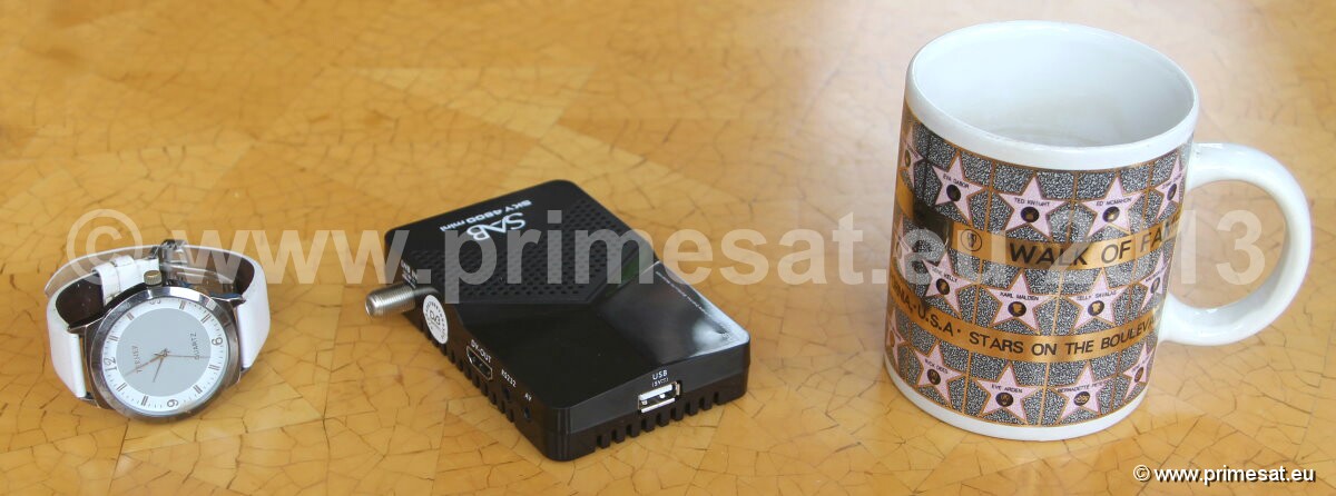 A small 12V HD satellite receiver. See the cup and watch to check out size (cup and watch not included) to
