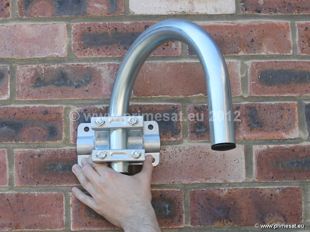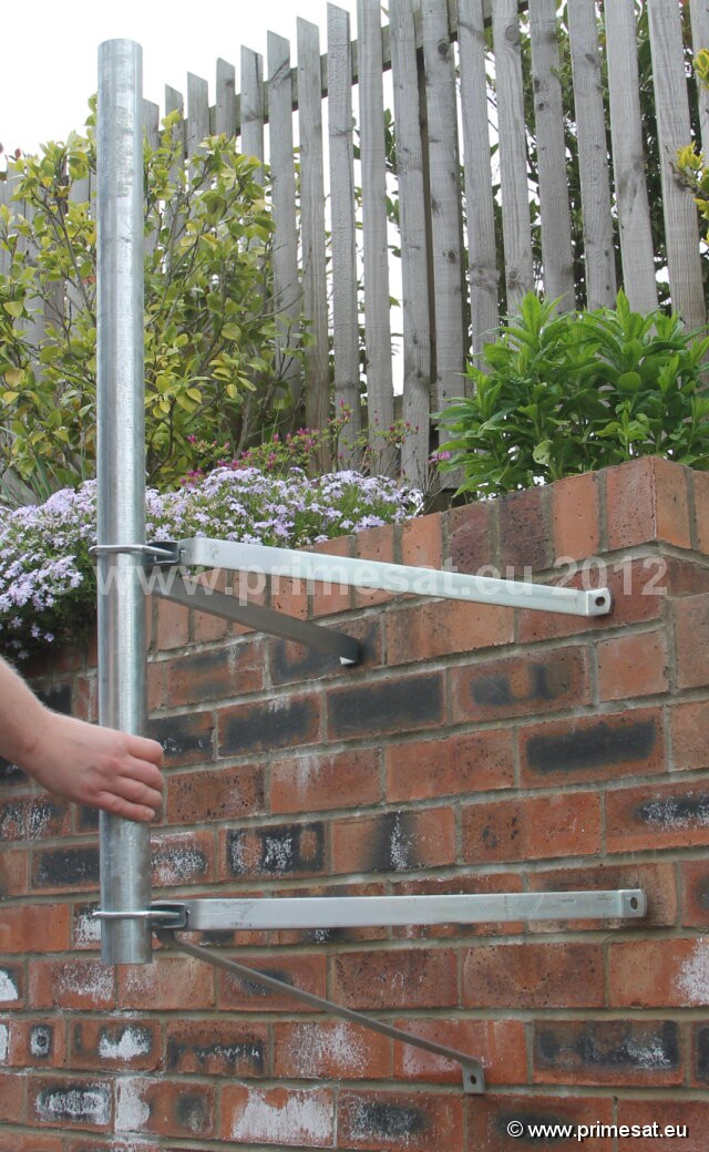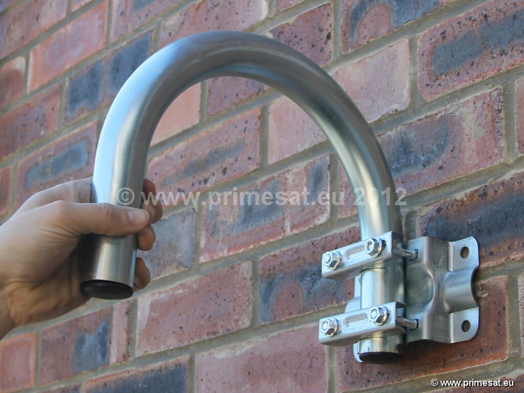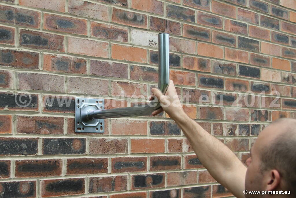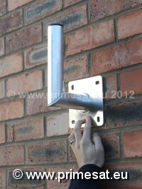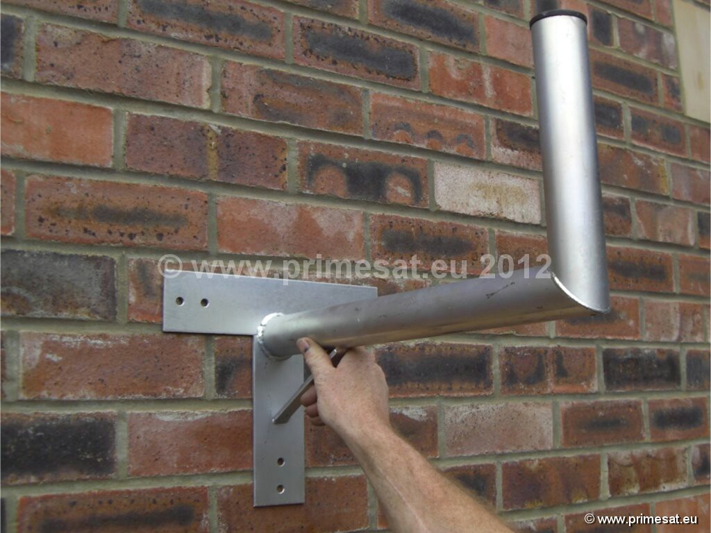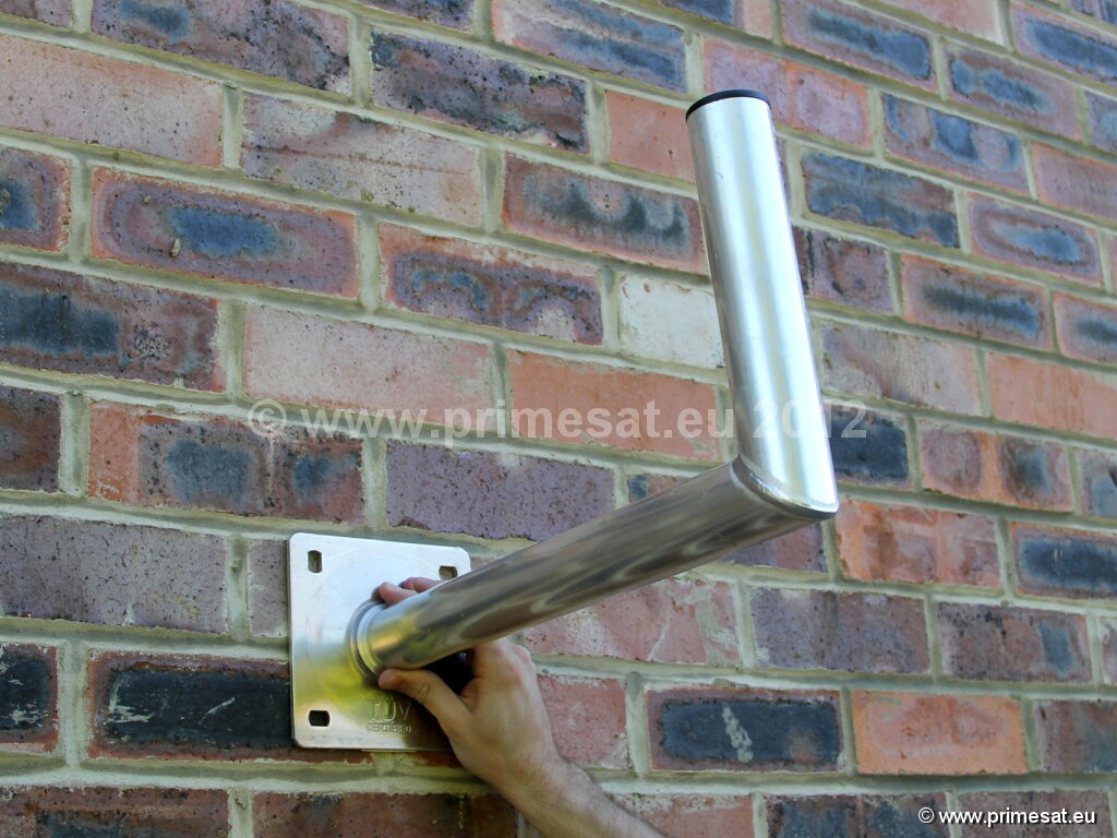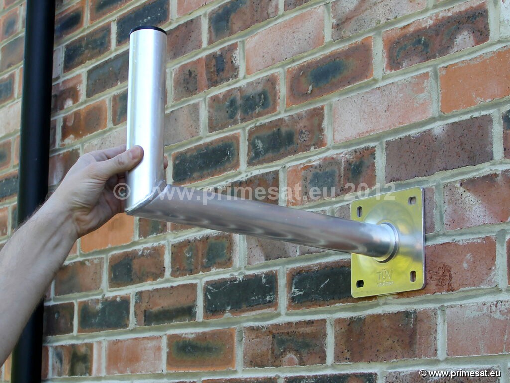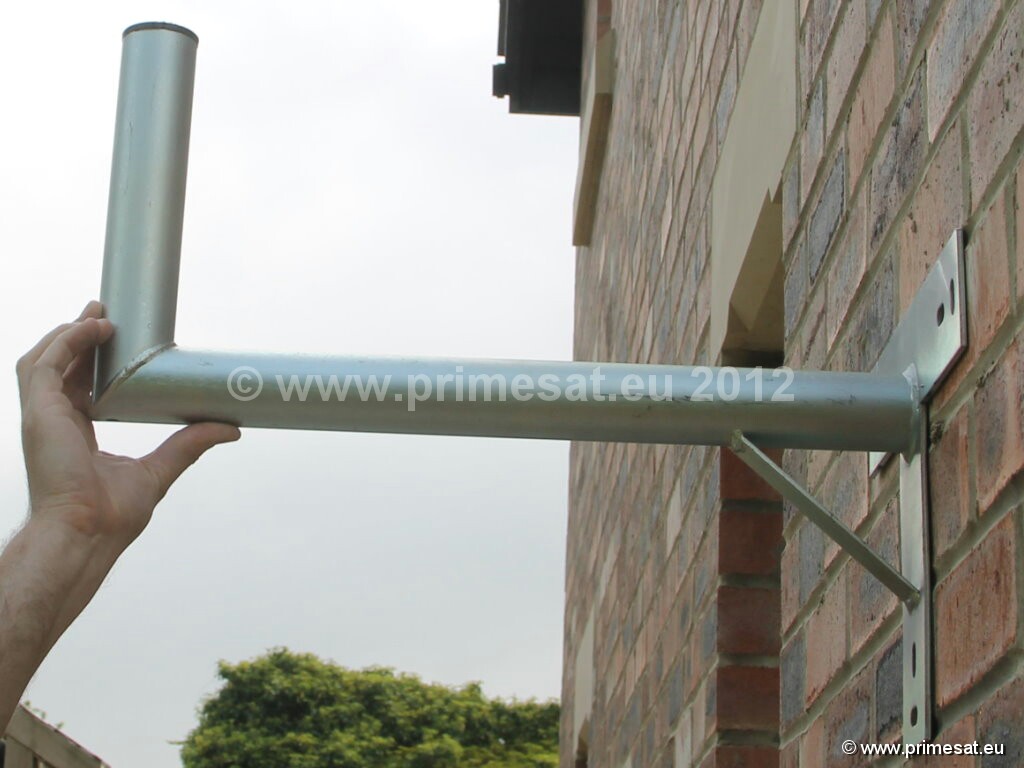 Wall MountMaterial - Aluminium.Construction. Welded AluminiumStand off distance 150mm to inside of pole.Pole diameter 48mmFixing method - 4 X coach bolts and plugs into the wall.Dish size - Ideal for 50 - 80cm dishes and 90cm dishes if facing south