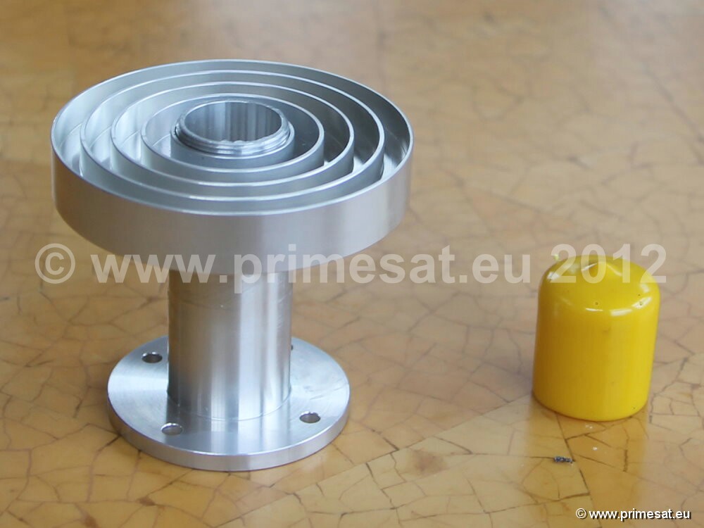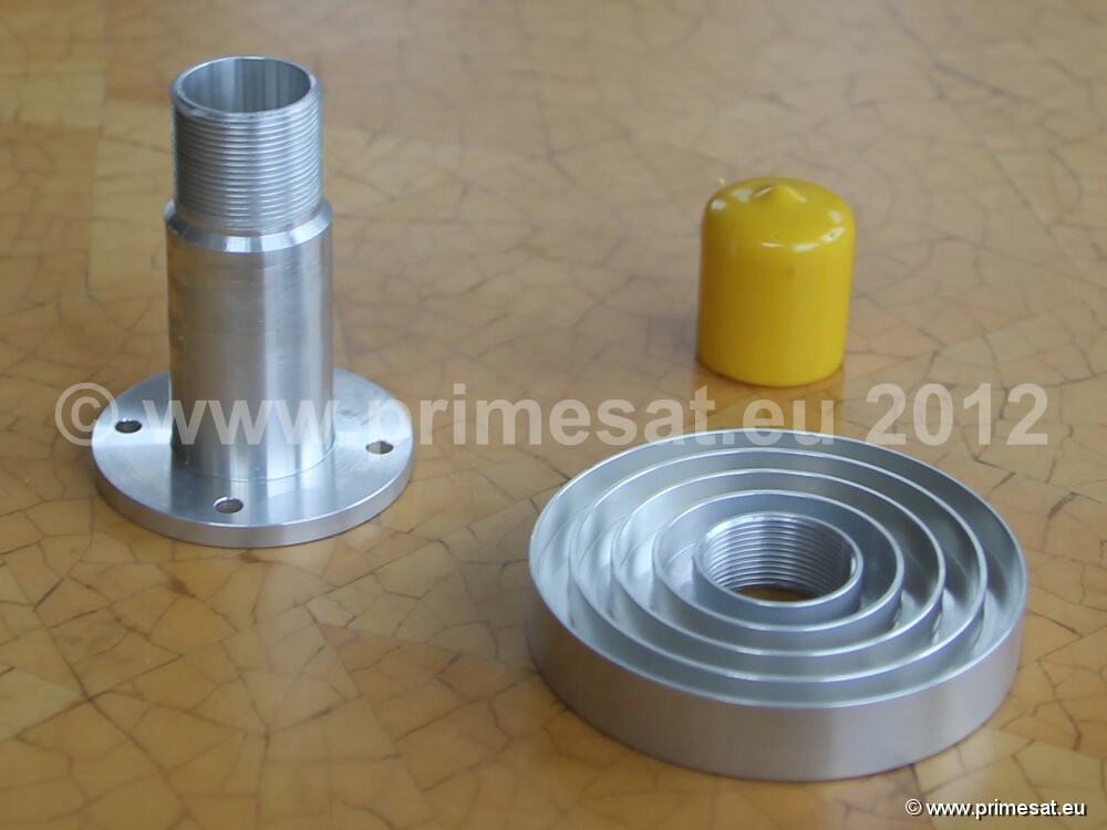 The Invacom feed normally comes from Invacom with no cap or cover and so the spiders can get in and lay their nests.The result is that they block the signal. We fit a yellow cap on the end. This is better than a flat coveras flat covers can be burnt through by the sun. Using a cap rather than a cover means that it is not at thefocal point and is much less likely to be burnt by the sun. This cap is included with all Invacom feedhornsand is exclusive to the Satellite Superstore. The Invacom feedhorn has a 23mm neck and a C120 flange It is made ofaluminium and has scalar rings. It is designed for prime focus dishes. The rings are adjustable on a screw threadPlease note that these important yellow caps are not available separately. Only with the feedhorn.Adjustable F/D 0.32-0.43. You can adjust the rings on the treads to set the F/D to suit your dish.See middle and right hand pictures below. Shown are different amounts of tread above the rings.When the feedhorn is taken out of the box from the manufacturer, the rings are assembled thewrong way round. (See left hand picture above). When unscrewing and turning over the rings and fitting correctlyit is VERY EASY for the aluminium threads to lock. If they lock they then strip when forced off.We pre-assemble the rings the correct way round, coating the threads with petroleum jelly so that they cannot lock.