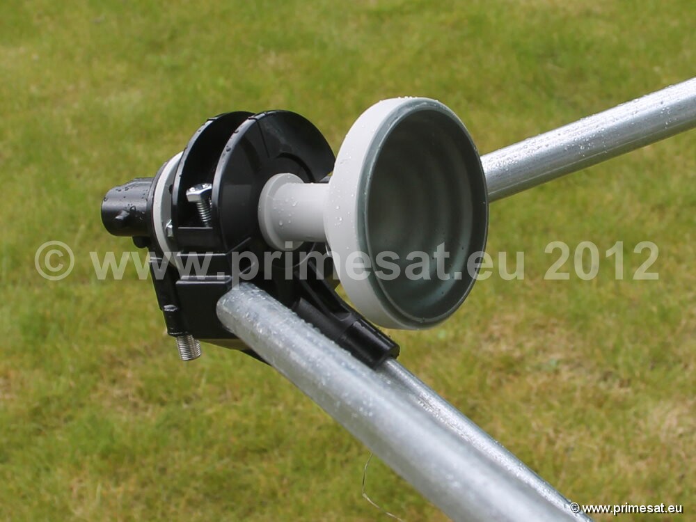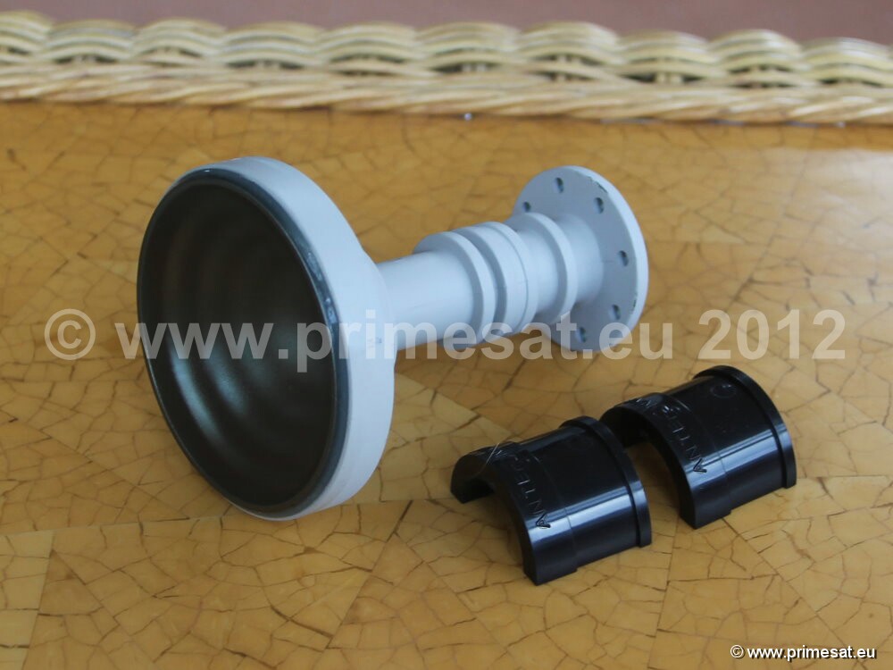 Raven feedhorn for all Raven (Andrews or Channel Master) offset dishes from 1.0m to 2.4m. Highly recommendedfor Raven (Andrews / Channel Master) 1.2m, 1.8m and 2.4m dishes. Use this feedhorn with a C120 flange LNB forbetter matching and improved signal to noise ratio compared to a 40mm clamp LNB of equivalent (or lower) noise level.Why buy a high quality Raven (Andrews / Channel Master) dish and use a compromise 40mm mass market LNB which hasa universal feedhorn / cap and is not designed for a particular dish? Taking a 1.2m dish as an example. A 40mm LNBmay only illuminate 1.1m of dish area (not enough) or perhaps 1.3m of dish area (i.e. including noise around the edges).With a matched feedhorn, exactly 1.2m of dish area is illuminated. This feedhorn is for offset dishes and can alsobe used on other makes of offset dish. It comes with adapters for either 23mm or 40mm clamps. Designed to beused with C120 flange universal LNBs (see below.) The picture below shows the feedhorn on a 1.8m Raven dish in Spain.Customers have also reported excellent results when the Raven feedhorn was used with a Gibertini 1.5m dish.Dish spare part - the plastic 40mm clamp Raven feed support boss which holds the feedhorn or LNB is also available