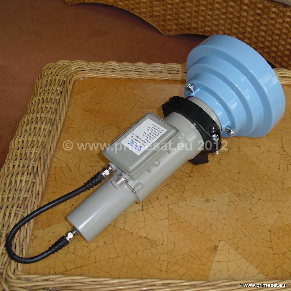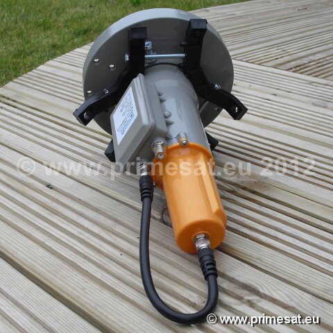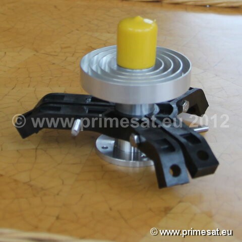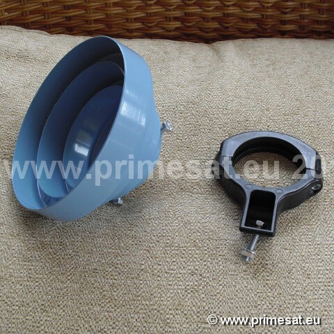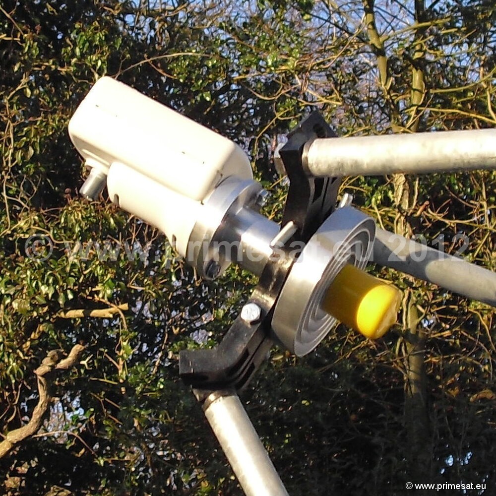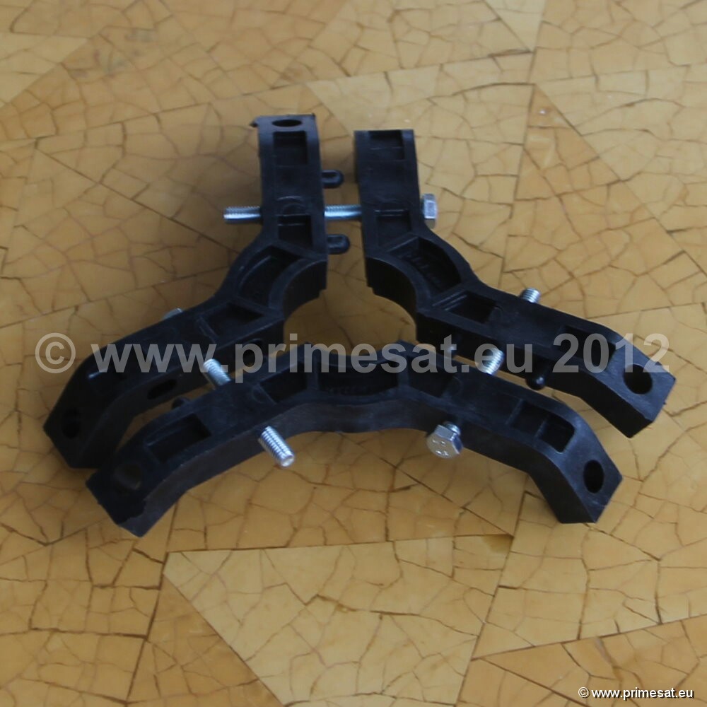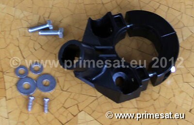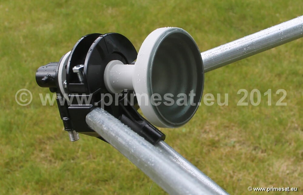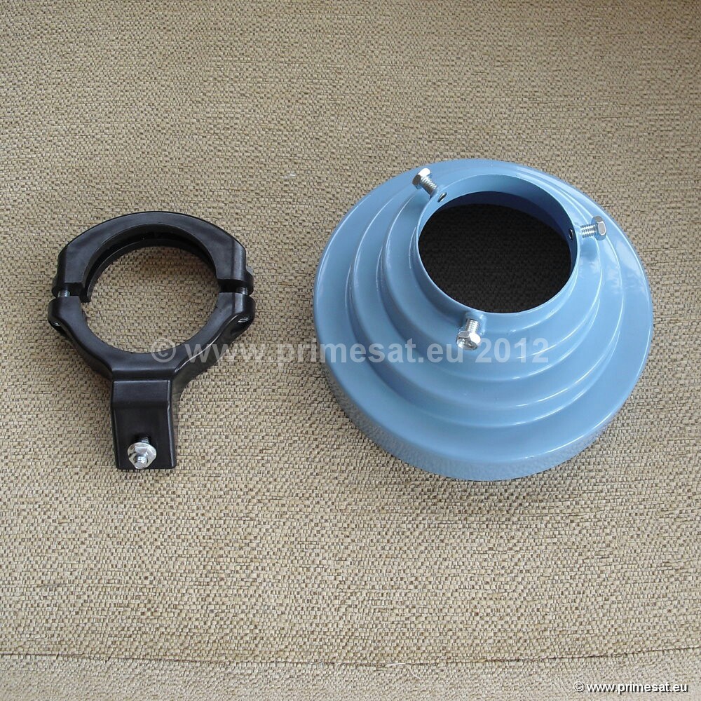Primesat feedhorn support boss (feedhorn not included).Shown above right is an Invacom feedhorn (not included) fitted to a Primesat feed support boss. If you need a way offitting a feedhorn to your prime focus dish, you can use this support boss to bolt everything to the ends of the3 rods onto your dish. The support boss has two angles to choose from as far as interfacing with the rods on your dish.Usually the shallower angle holes would be used with larger dishes. With this support boss, this feedhorn can befitted any prime focus dish that uses 3 arms although the bolts at the ends of the rods may need to be alteredto suit the size of the holes in the boss.Adjustable for 23mm or 40mm feedhorn necks.