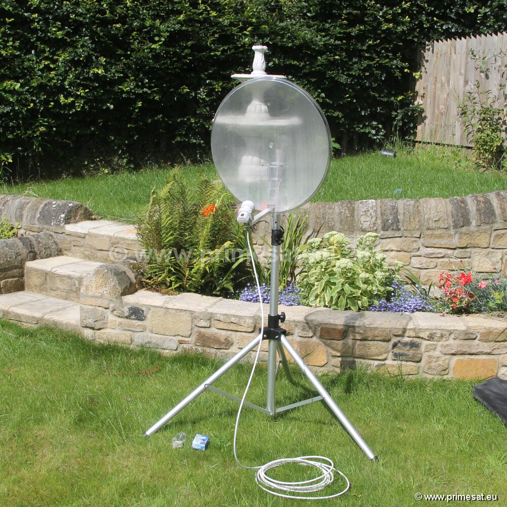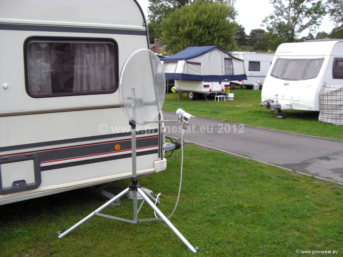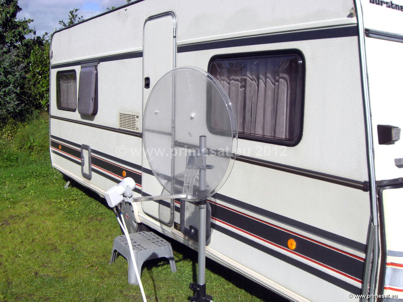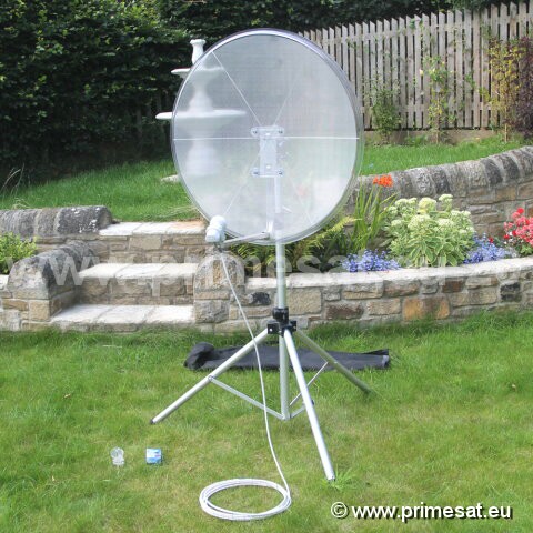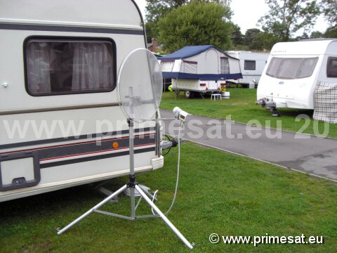 60cm transparent mobile caravan dish kitClear dishes are made of fairly soft plastic (compared to metal) and will not harm anything in thecaravan (when it is being carried in and out) or car boot while being deployed or stowed away flat.Even the bracket on the back of the dish is now transparent.The dish has a removable push fit LNB arm This dish kit works far better than those small,often only 45cm, caravan dishes from caravan centers.Primesat transparent dish. Titanium LNB, folding stand, 20m made up cable and Lensatic Compass If used with twin tuner receivers like Sky +, Sky HD, Freesat twin tuner etc. it is possible to upgradethe single LNB to a twin LNB and the single cable to twin cable This is the Titanium third edition 0.1dB LNB which is widely praised on many web sites.The third edition has the gold connections and is very low noise. An ultimate performance LNB.20m of white, made up digital cable (white looks better than black for outdoor use.) The cableis fully made up with connectors fitted on both ends. Professional compression F connectors are used fora tight durable watertight seal. No tape needed. A very high quality push fit f connector adaptor isincluded on one end of the made up cable for very fast connection to the LNB.Deluxe lightweight aluminium folding ground stand. The pictures show the dishon the deluxe stand. The stand has holes at the end of the legs for pinning down with tent pegs (included).This is the deluxe UK model (beware of Chinese copies that fall apart after being used a couple of times) now with a 500mm height extension. Good for looking over obstacles but also ideal for raising the dish to an easy height for assembly without bending down. The complete kit is packaged withour own detailed setting up instructions based on 21 years experience of both satellite TV andcaravan touring all over western and eastern Europe. These instructions detail all of the shortcutsfor fast setting up and satellite location. If you need a satellite meter (if you don't have one, you will need one,) check out the Lexium Fastalign 5110 meter. If used for Sky or freesat from Astra 2 at 28E this dish is ideal fortouring in the UK and should receive all Sky and freesat channels as far southas Paris however, we would recommend the 85cm transparent kit below if youintend going to the south of France.