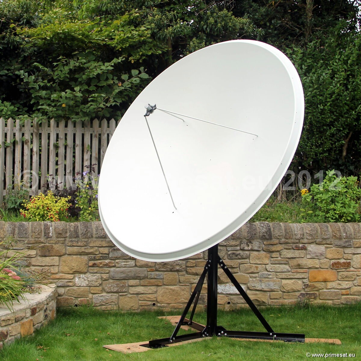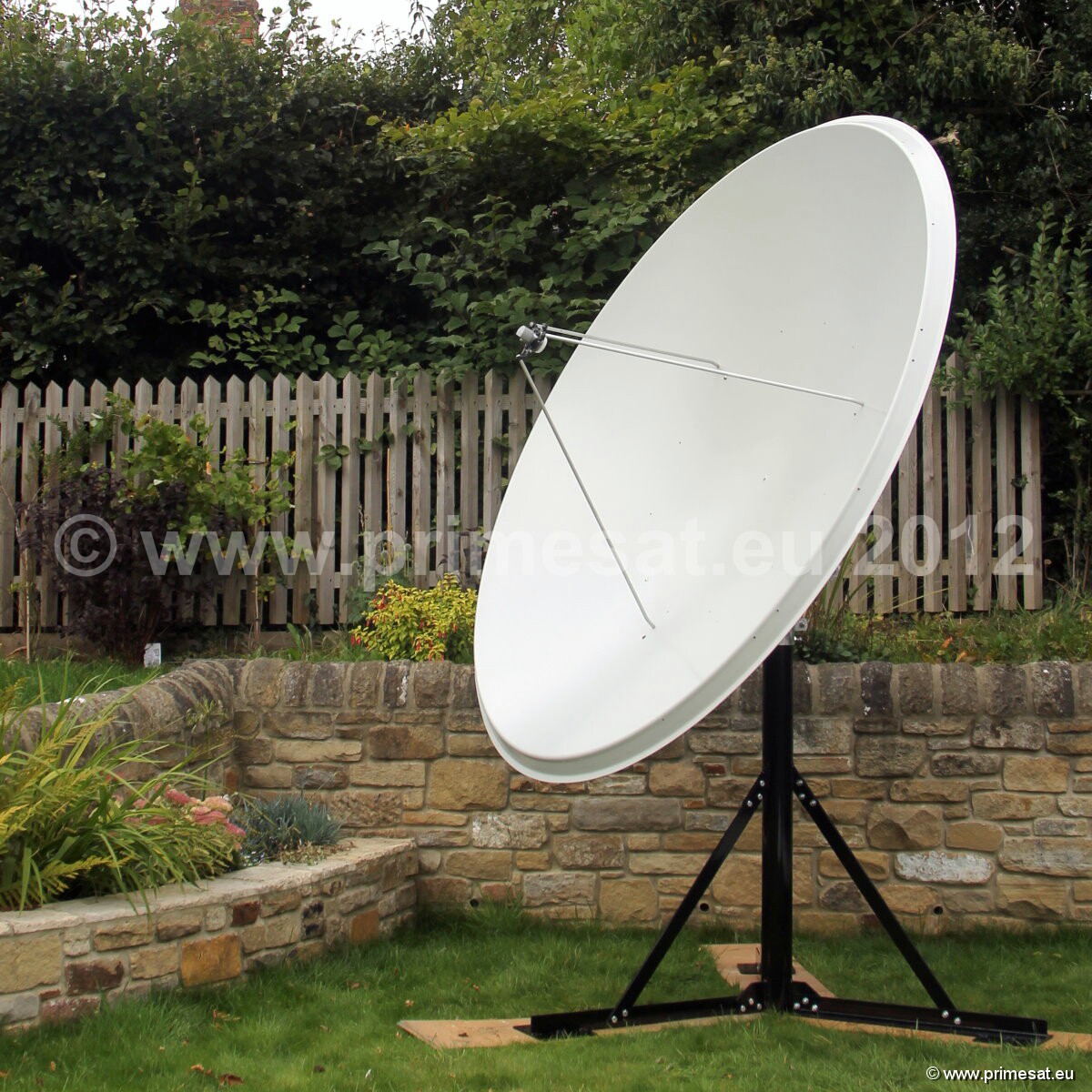Primesat P23MOT 2.3m prime focus motorised dish. At last a high gain high quality prime focus dish.In the early days of satellite most dishes were prime focus. These days most dishes are offset.This is two ways of doing the same job but prime focus dishes point upwards and look purposeful.From the appearance point of view they are usually the enthusiast's favorite. This one ismade of aluminuim and is one piece. (As a general rule, aluminium is preferable to steeland 1-piece tends to be more efficient that "petalised" or segments.) This attractive dishcomes complete with a very heavy duty polar mount, a prime focus Primesat matched feedhornand Inverto LNB. The polar mount is "dipped galvanised" which is the best possible type of treatment for withstanding corrosion in high salt areas. Everything about this dish is high quality. All of the nuts and bolts are made of stainless steel. The elevation adjusters are made of brass.An optional Primesat ground stand with a 100mm diameter pole and at 1.4m high is also available. 24 bolt fixing.